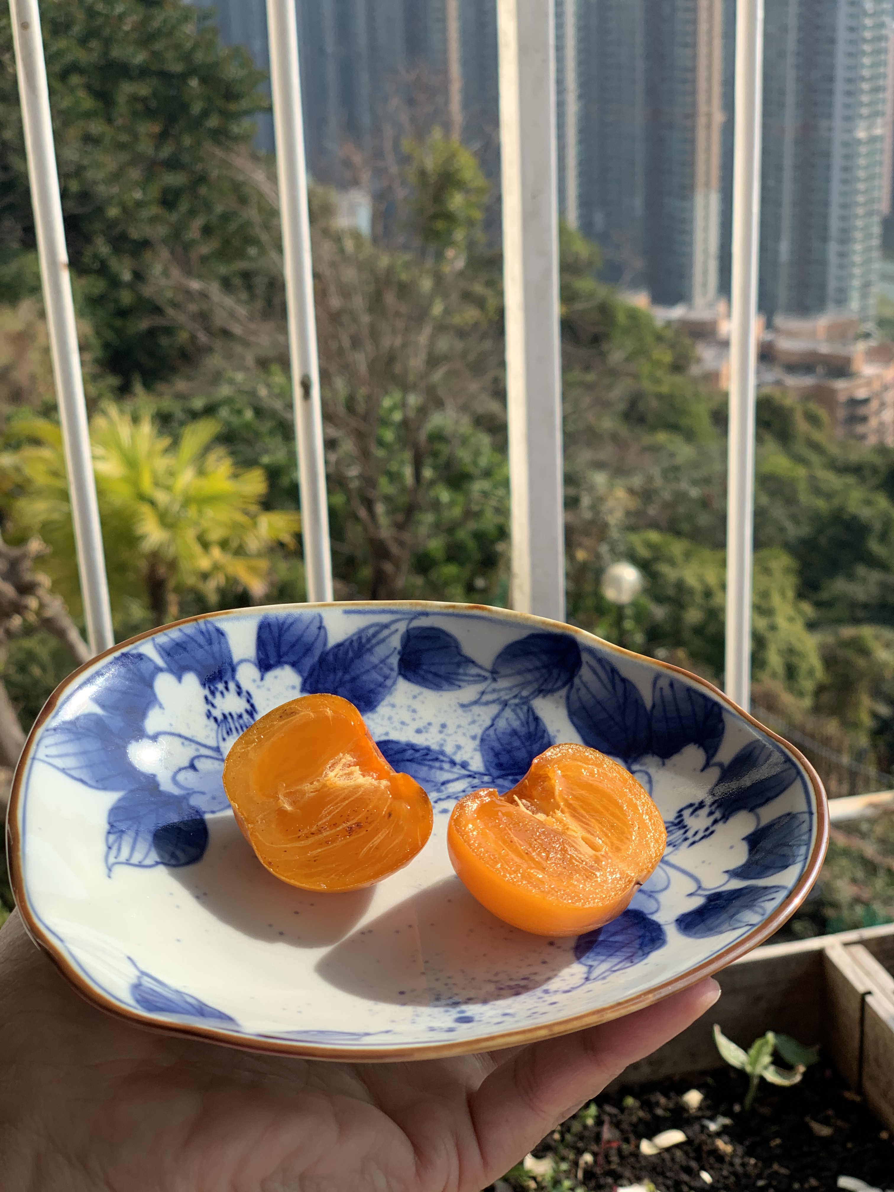 A bird brought us this persimmon from our neighbour’s persimmon tree. Delightful to look and delicious!